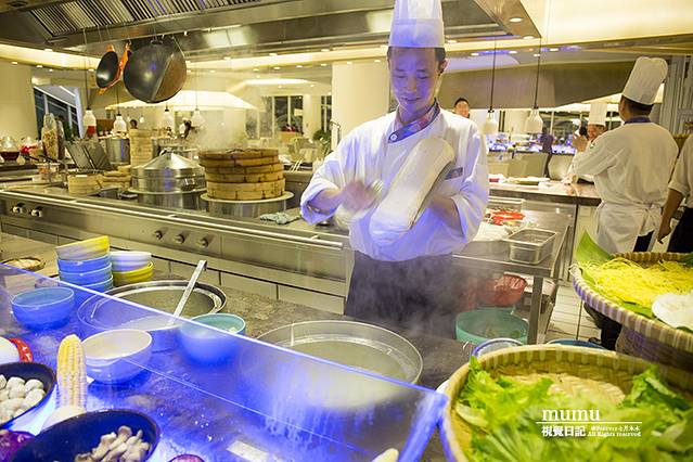 海洋餐厅有4个区域操作间,都是开放式的,有各式美味海鲜,粤菜,湘菜,川菜,海南菜,山西面食等多种,这里的厨师都是从各地请来的专业级的,需要强调的是这里的甜品,绝对是我吃过的所有酒店中的NO.1,经过打听之后才知道,原来均出自迪拜七星帆船酒店主厨领衔实力团队之手,而甜品的艺术在于,看起来似乎很着坚硬的外壳的甜品,轻轻咬一口,原来如此的酥软,有着如此柔软的内心,仔细品尝,虽夹层有奶油,似丝毫不腻。这里的甜品都是经过特色的设计,小小的一块,却是有很多层的工艺,每一层都有不同的味道,细品中充满不断的惊喜。