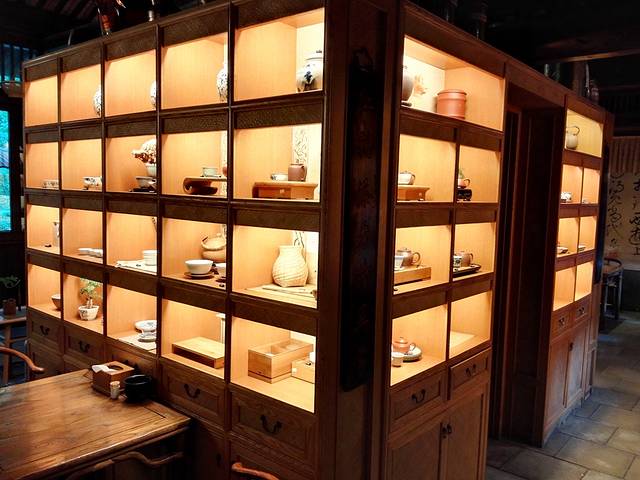 茶馆内的展示柜上摆放着各种各样的茶壶茶杯,一边喝茶一边还可以与好友讨论讨论茶文化,也是很美妙的事情。