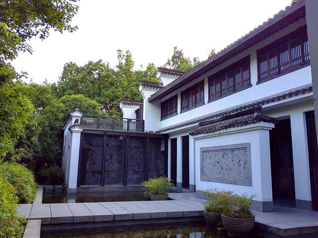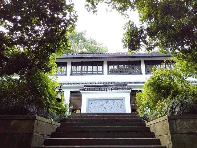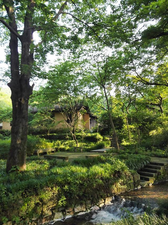 去餐厅的路建在屋前的小水池上,一块块石板整齐划一,二楼的小露台被高耸翠绿的树木包裹着,往下一望,正好能将鱼儿游戏在水里的情景收入眼底。