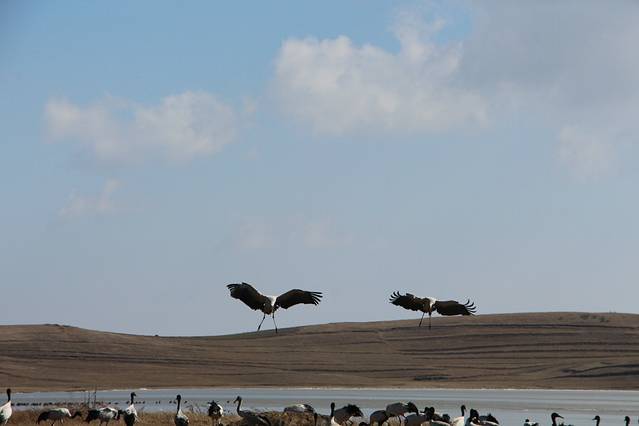 到达大海子,工作人员刚好在喂食,个人觉得黑颈鹤没有想象的那么壮观啦,拍拍照就差不多了。不过周围的风景是真的很不错的,那种游客中心人很多,所以有点脏兮兮的,建议走远点风景会更好,人也少一些,处处都是风景。