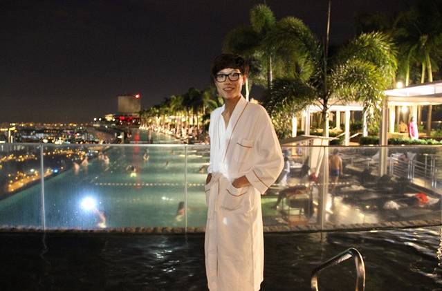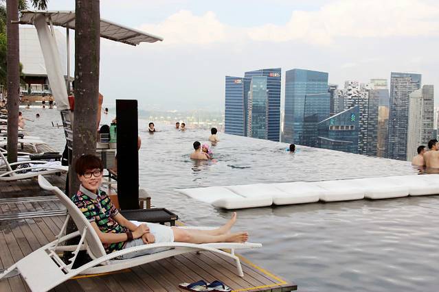 早餐吃得很饱,坐在空中花园的椅子上休息,欣赏无边泳池的风光,心情特别好。