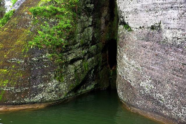 当我们的游船试过石门湖畔的一面石壁上,遇到了传说中的“生命之门”。光滑的石壁突现一狭缝,缝中临水处有一眼黑色的洞,洞的四周长着小草和青苔,洞下水光辉映,这画面活脱脱就是人类的“生命之门”。大伙忍不住都要围过来拍摄,搞得游轮有些倾斜。