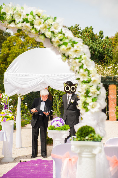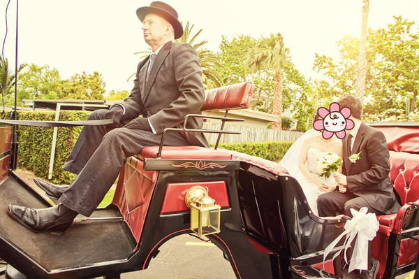 马车已经在门口等着我们了,一看到马车,立马镇住了,是国内没见过的高头大马,白色骏马,穿戴整齐,两位马夫身着礼服,微笑亲切,一切都像我想象中的童话婚礼一样,不枉花了我将近1万大洋!迫不及待的踏上马车,可能是我太急切了,我的鞋子卡在踏板上掉了,于是那位马车主笑我是“灰姑娘”,婚礼的主持人是一位香港来的太平绅士,很有腔调,很认真的和我们确定细节。中途有很多热情的新西兰人围观鼓掌祝福,还有很多可爱的小朋友,事后想到其实可以请他们当花童的。