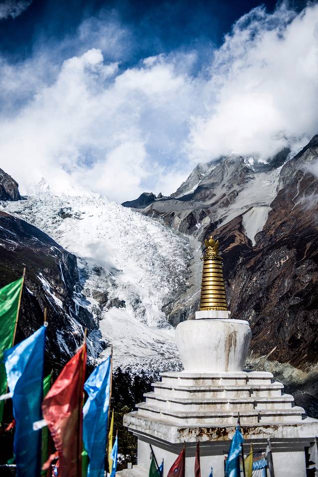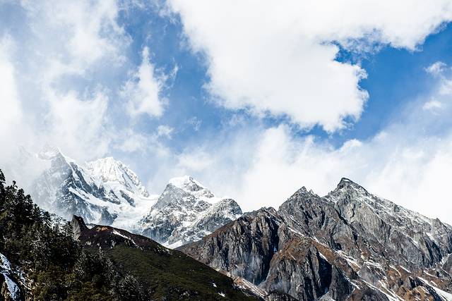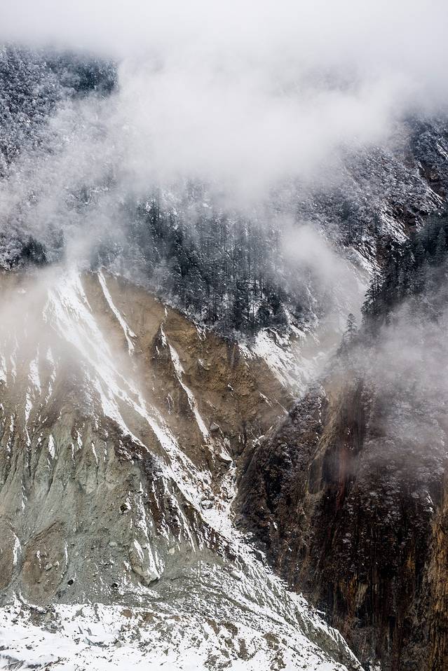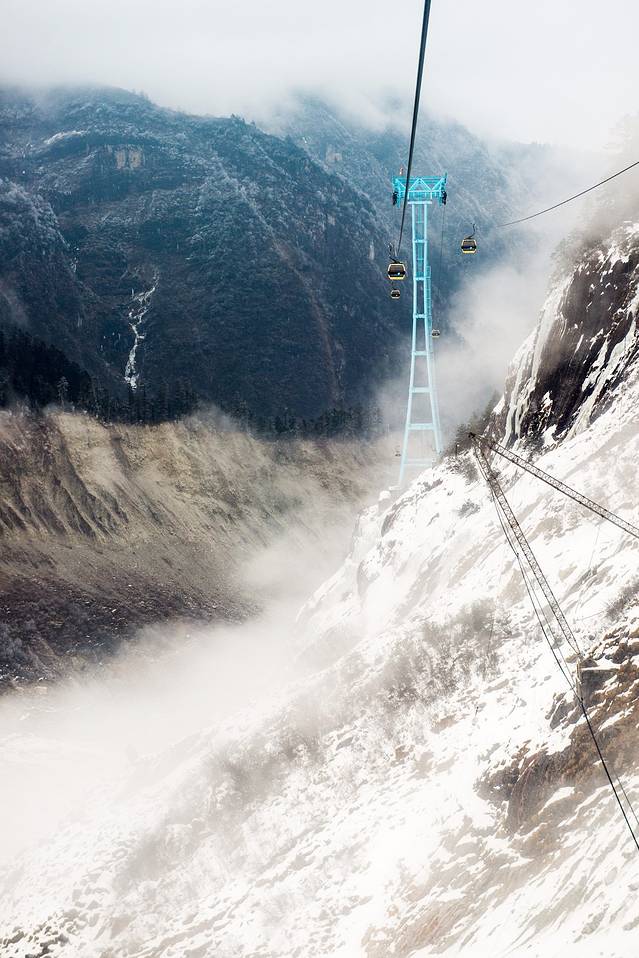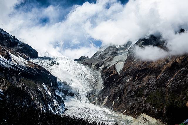 刚到海螺沟的时候天气不好,山上全是云雾,看不见贡嘎雪山。顺便科普一下,海螺沟实际上是贡嘎雪山下边很远地方的一条山沟,雪山上的冰雪慢慢移动到沟里,就变成了海螺沟冰川,冰川这玩意儿并不是白色的,也不是晶莹剔透的,实际上它是灰黑色的,看着并没有想摸一把的欲望。海螺沟能看到冰川的地方在山顶,海拔大概能有三千米左右,上去以后会感觉明显缺氧,行动一定要慢,我背着几十斤重的相机包在山上爬了没多远就不行了...