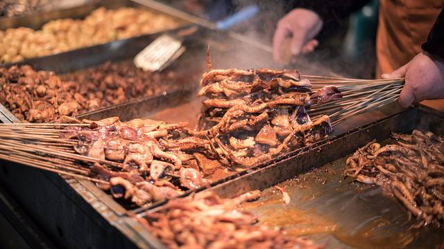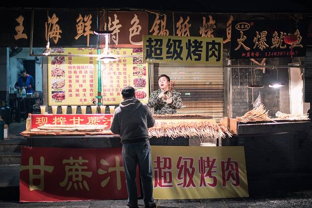 烤面筋、烤羊肉串,这都是已经搞不清原产地的小吃了,全国通用。倒是开封的焖炉烤串还有点儿新意。在北京逛庙会也是一样的形式,真正卖北京小吃的摊位通常干不过鱿鱼、面筋羊肉串。照这样发展下去,以后咱再出去旅行,真就没必要逛夜市了,反正全国都一样,地方特色全给磨没了。