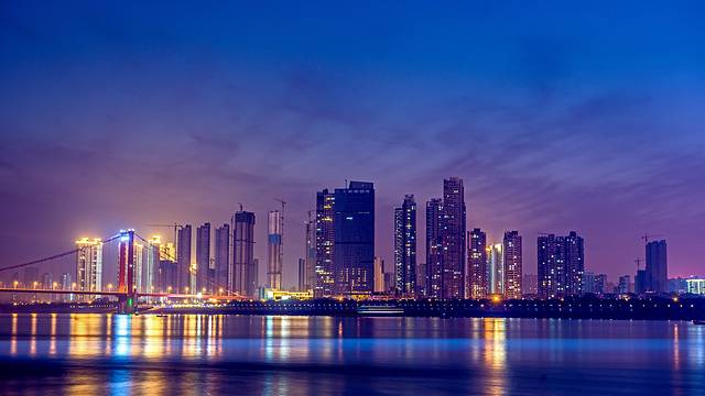 不知道为什么大桥上的灯就亮了一截...拍出来很奇怪。拍长江大桥,或者说拍城市夜景其实最好的时间是黄昏以后,太阳刚刚落到地平线以下的时候,天还没完全黑,这样拍出来的照片天空颜色会很好看,如果赶上天气晴朗而且有云的话,效果更好。在大城市想拍带星空的夜景基本上不太可能,因为城市灯光太亮,把星星都盖住了,就算是一张拍城市,一张拍天空,两张合成效果也不会太好。