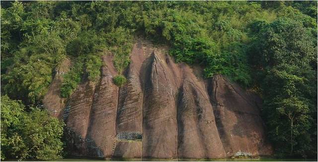 锦岩石,丹霞山的主峰。流水作用把山体切割成了三部分,从左到右分别是海螺峰、宝珠峰和长老峰。中间色泽明亮的崖壁看见了吗?崖壁因红色而名为“赤壁”,这红色崖壁叫“赤壁丹崖”。