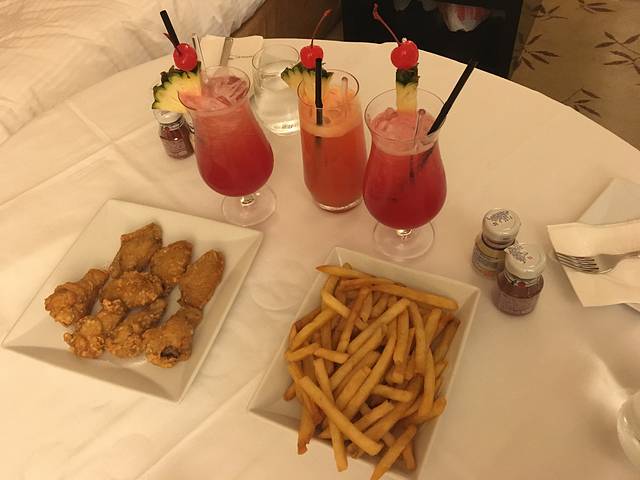 吃完回酒店,无边泳池必须去,可惜脚上有伤口不能下水,独自去了健身房,风景一样很美,还第一次在酒店点了room service,新加坡司令总算是喝上了……