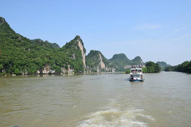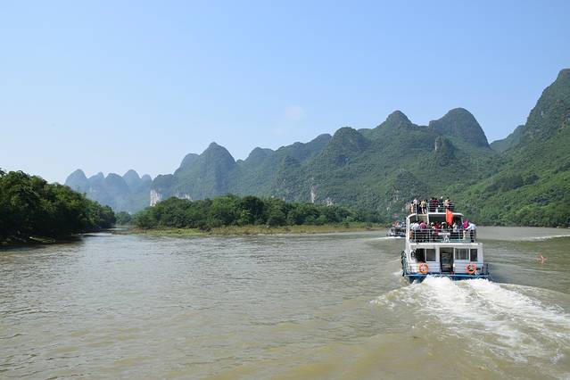 这次是我第二次来桂林了,所以轻车熟路,在去哪儿网上预订了漓江船票,是由竹江码头上船,到阳朔,中间航行4个小时。船是两层的豪华大船,每人三百,含餐。餐是盒饭,但还不错,有点类似航空餐。想到二层的话,要每人多加100元。感觉没必要,开船一会,大家就全跑到甲板上看风景了,舱里直接没人了。