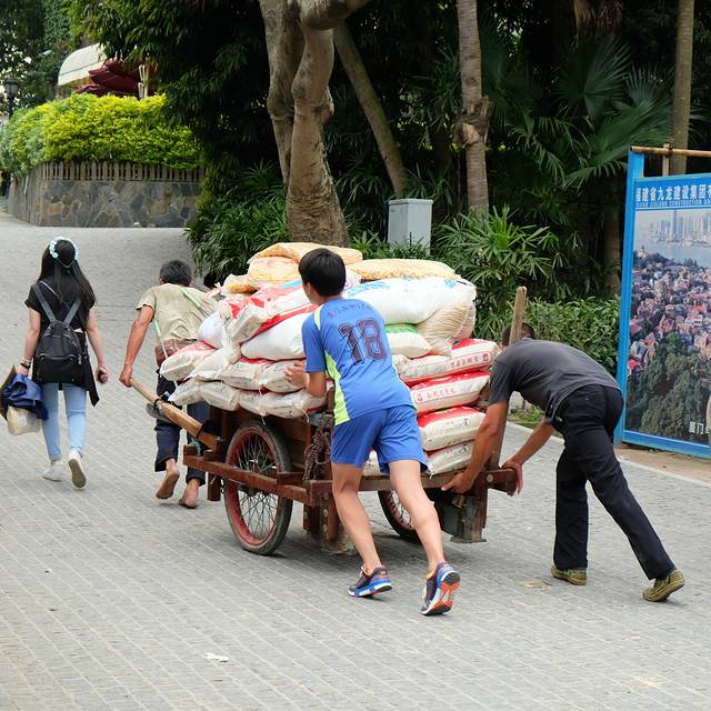 岛上没有汽车,也正好在翻修,很多材料都是用这种小板车拉的,出了刻字馆,准备去皓月园