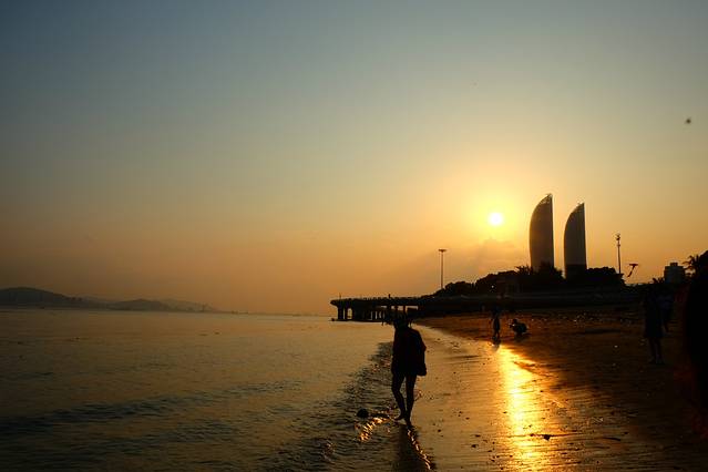 再次转来这里,太阳已快要落山了,海边的日落,整个沙滩都是金黄色的,