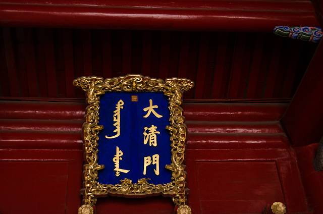 大清门是盛京皇宫的正门,蓝底金字的匾额,朱红色的殿门,金色的门钉,铜质的狮子兽头门把手......瞬间把我们带回了那个皇权威严的年代,那个时候我们脚踩的地方还叫做“盛京”。