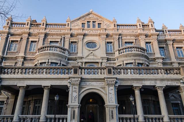 这座用青砖搭建的仿罗马式建筑——大青楼,才是张氏帅府的标志性建筑。浓浓的西洋风与传统的四合院截然不同,仿佛绕过一道假山便来到另一个世界。高大的罗马柱,精致的西洋浮雕,别致的半圆形露台,简直是藏不住的奢华。