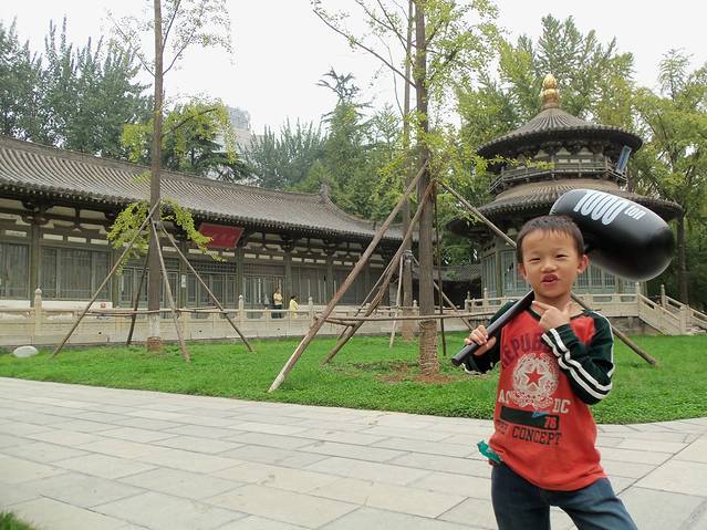 兴庆宫很大,从侧门进入,早晨的人不算多,以锻炼为主,是西安市内最大休闲娱乐公园,园内风景秀丽,空气清新,仿古建筑众多,娱乐设施齐全,豪不夸张的说,进来了就不想出去啊。各种大殿呈现眼前,兴庆湖湖面宽广,做在游船上种种睱想应然而生,湖旁休闲长椅是绝佳观赏之地,垂柳倒在水面上轻轻拂动,睡吧睡吧。娱乐设施适合不同人群,好玩极了,惊险与刺激并存。要想文化味,那当然是碑林文化街,什么古文字画,印章钱币,收藏文物,精美玩具,地方特色,你想要的都可以寻到,那文化范特别浓,气息特别香,淡妆浓抺总想宜。