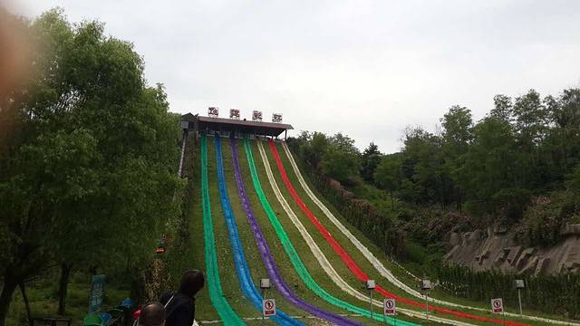 飞越彩虹就是坐在滑草盆内,从108米的滑草道在短短几秒钟内飘然而下,在惊险刺激中享受滑草的快乐。一行12人,只有两位男士恐高没敢滑,从旁边的便道走了下来。此项目,包括后面玩的项目全免费哟。
