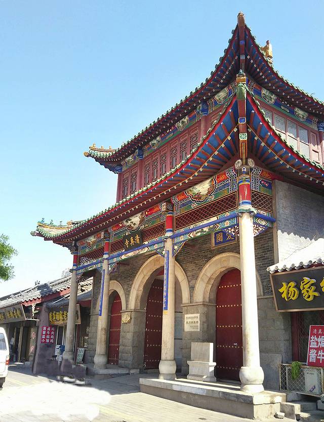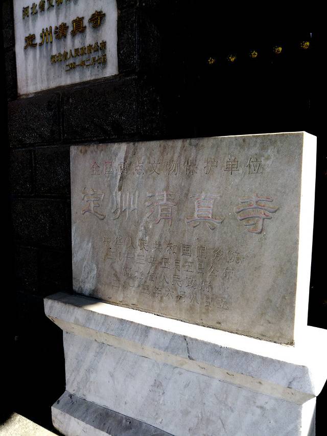 步行10分钟左右就是清真寺,国家级文物保护单位。这定州清真寺年代久远,始建于元代,以后的各个朝代都有重修才保留至今,四合院式建筑。临街大门是两层歇山顶楼阁,朝向马路的一面三个门洞的正中有“清真寺”三个字,