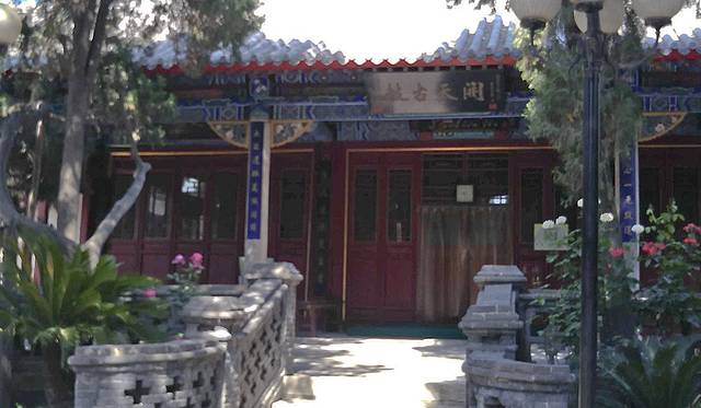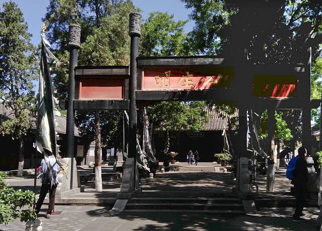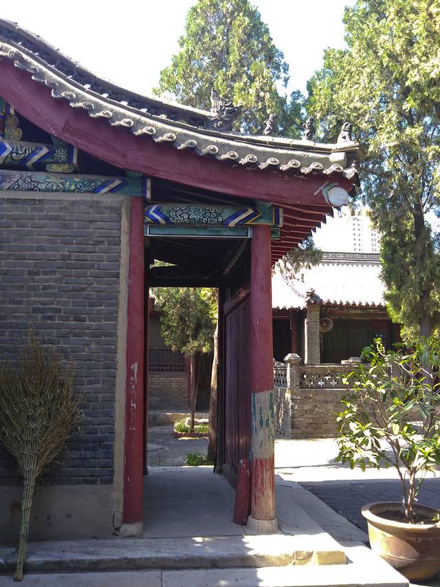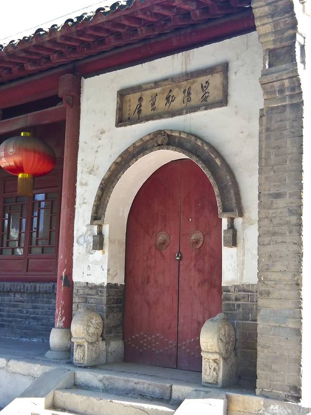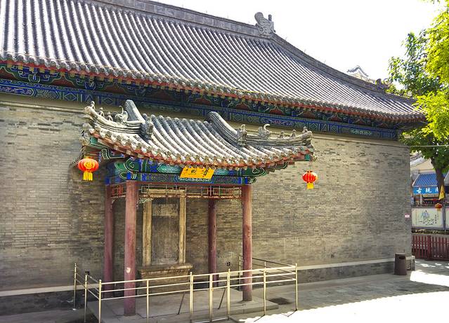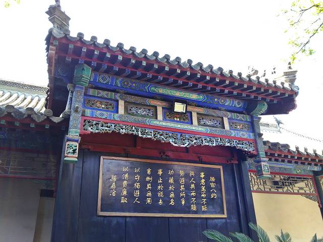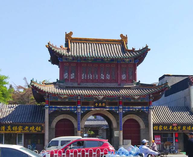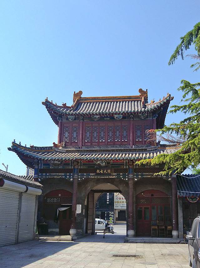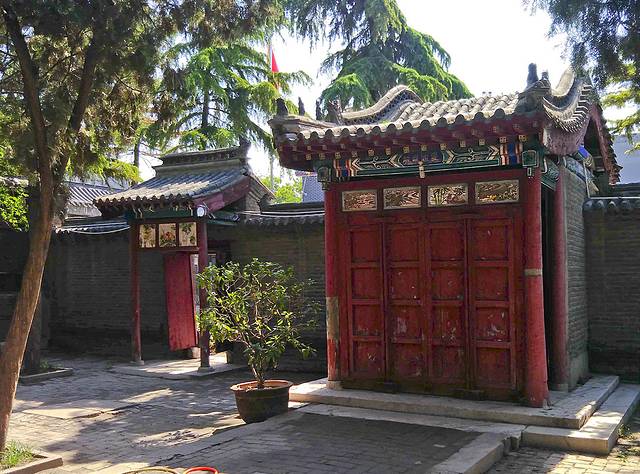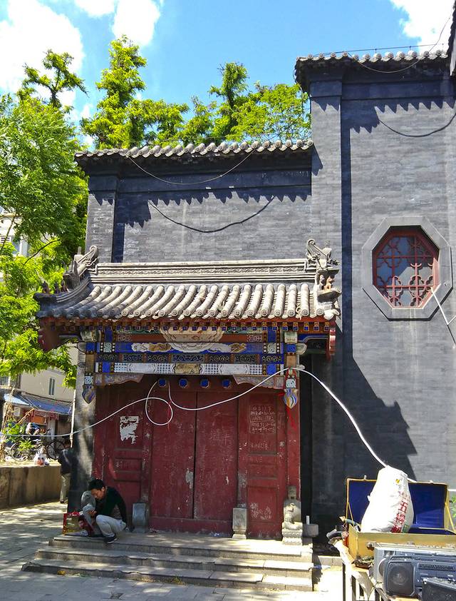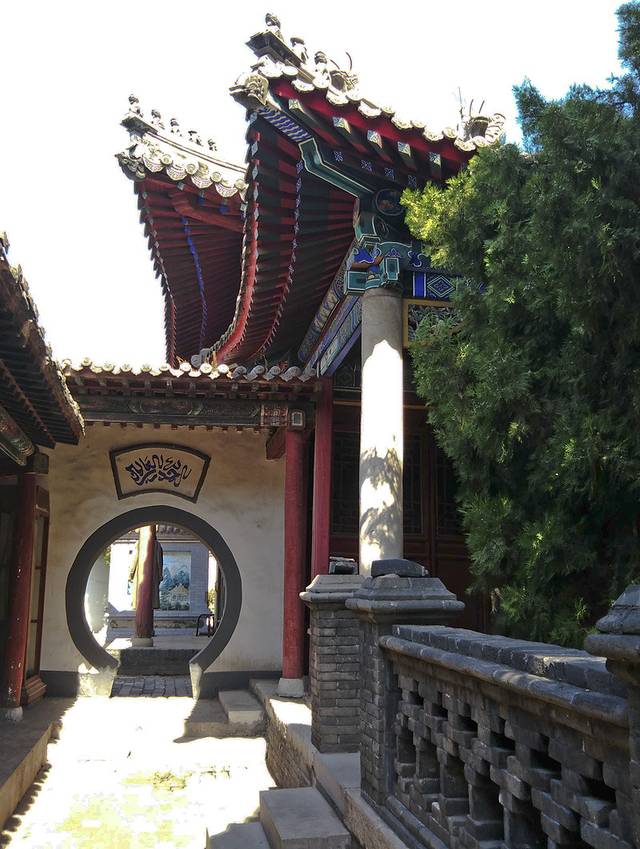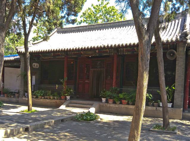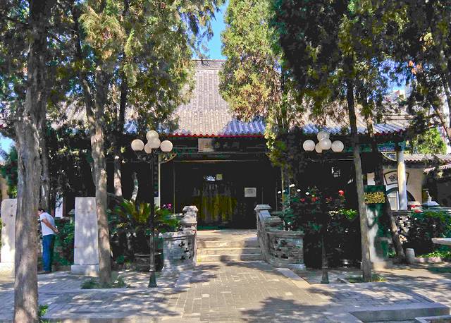 门口无人看管,我竞直走进去,左边的垂花门楼很漂亮,从门楼进到左侧的院子,中间是安静宽阔的正殿,庑殿顶卷厦,高悬乾隆御书“开天古教”匾额,字体苍劲。门楣上是阿拉伯文匾额,上书“清真言”。没有活动大门紧闭,虽然没人但知道人家讲究颇多,也没敢上台阶到近前看看。据说后窑殿仍然保留部分元代建筑形式,是我国现存最早的砖无梁殿结构,可左右看了看好像过不去,已给档住了,只好作罢。又仔细欣赏了会儿那卷棚顶的垂花门楼,院子里还有一些散落的古石碑等。