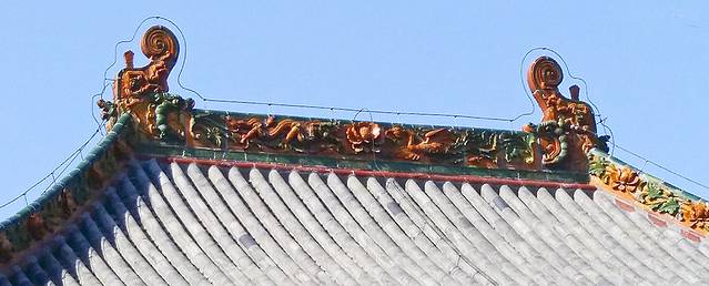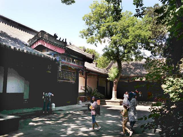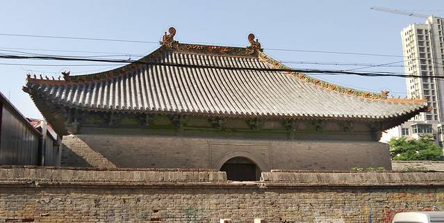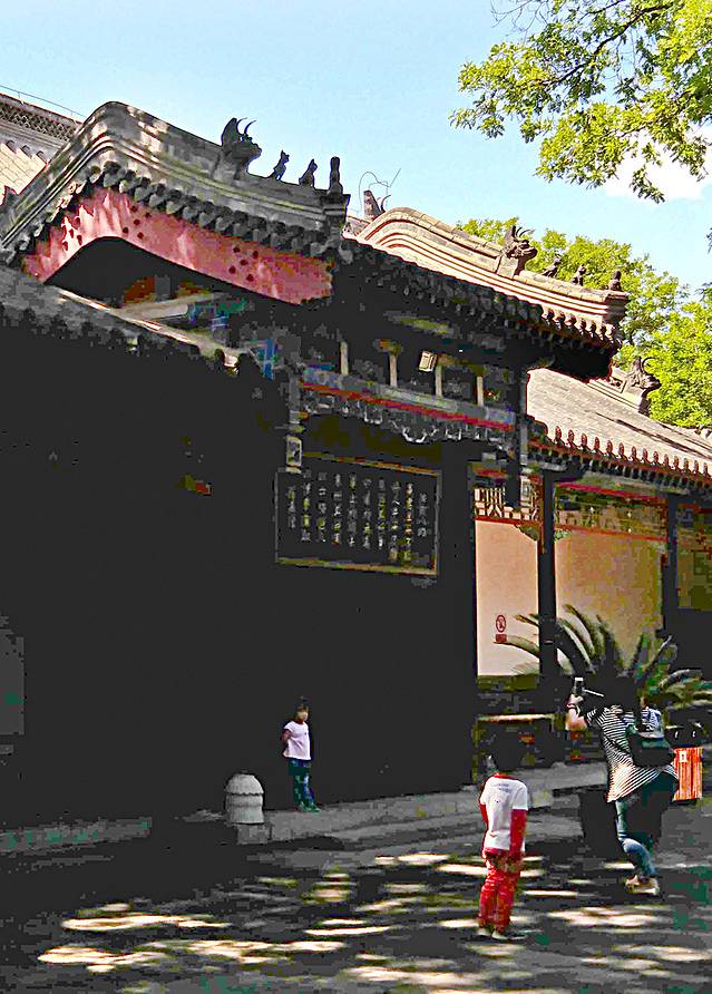 7:30乘2路找寻大道观玉皇殿,很快找到,但没有门,只找到一个临时的小破门,锁着。从墙外看大殿已修复得很整齐了,为什么不让参观呢?这玉皇殿是元代建筑,明代重建,殿内四壁现存明代万历年间的沥粉贴金帝王出巡图,全国重点文物保护单位,可惜无缘相见呀!
