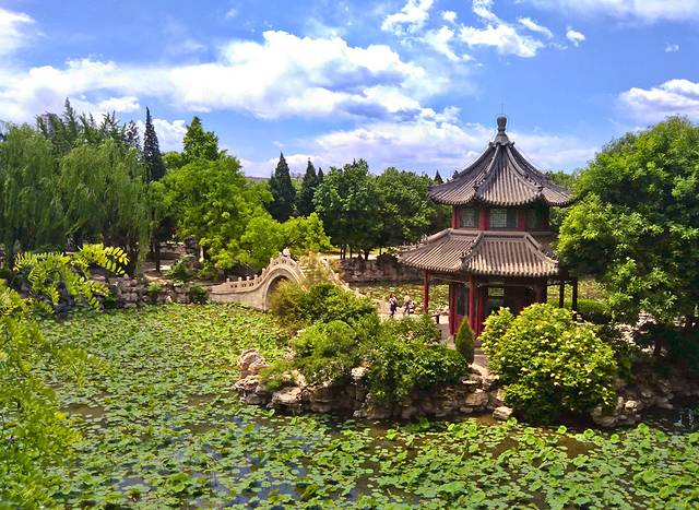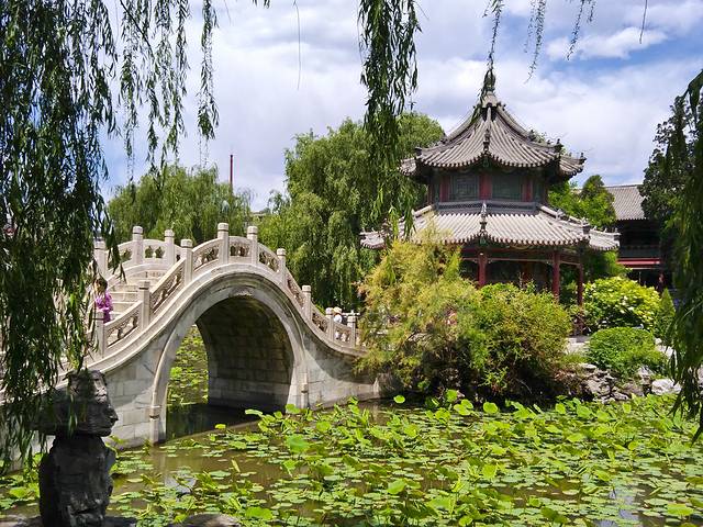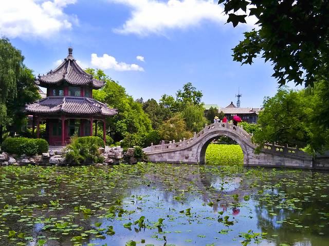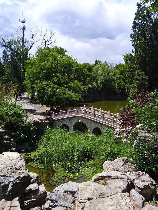 莲花池中满池莲叶,还没到开花的季节。池中的临漪亭在正午的阳光下于汉白玉拱桥相伴而立。