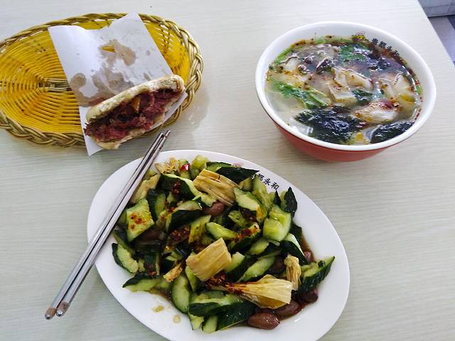 一个人出行不太好品尝美食,而且在保定的定州也没发现什么美食,著名的当地特产—驴肉火烧品尝了两家都不是太好吃。下面仅推荐一家适合一个人用餐的美味快餐店:保定火车站东广场附近的驴肉火烧店