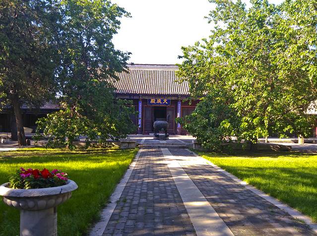 出了大慈阁,按照各景点间的位置下一个应该是关岳行宫,可没什么得劲的车,不到一公里还是慢慢走着吧。这个季节的天气比较热了,但还是与夏天不同,走在树荫下时小风还是凉爽的。快到时路过一个好大的古玩市场,与北京的潘家园类似,我也东张西望地希望淘点什么宝贝,可不懂行呀。最后看见几个人在挑选佛提子珠串,价格也不高,我便跟着选了一条。哈,又给自己寻了个实物宝贝。