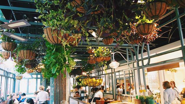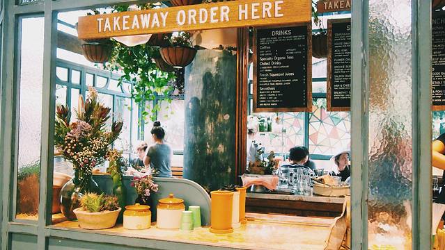 走进一家以花为主题的餐厅享用午饭。发现这区的香港人比较多,到处都能听见有人说正宗的港式粤语,感觉非常亲切。餐厅格局不大,装修细致,在摆设上花了一番心思,文艺气息的窗花挡不住往窗外生长的吊兰,让人置身于温室花园之中。高挂的果香,花香与咖啡的香气四溢,餐桌摆设具有美感,色彩缤纷的配搭与食物摆盘互相辉映,让人顿时垂涎欲滴。难怪这是商场里面人气最高的餐厅,实至名归。
