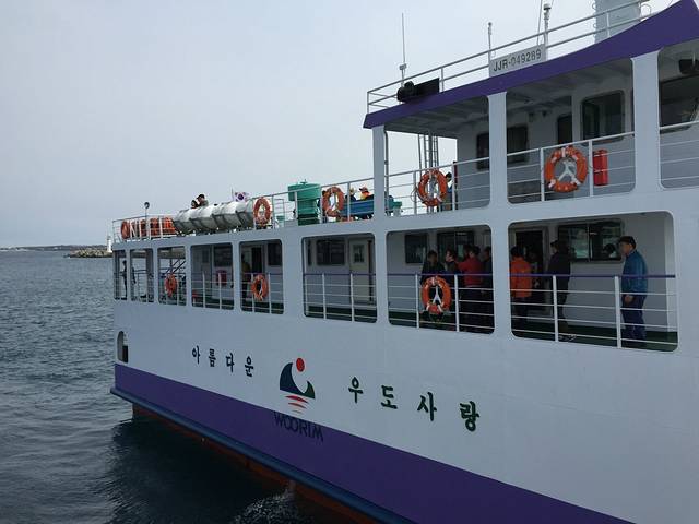 乘的这艘船从城山港码头去牛岛,15分钟的时间,船上没有座位,只有韩式的通铺。韩剧里经常见到的场景,进去后拖鞋上去随便找个地方坐着躺着随你乐意。