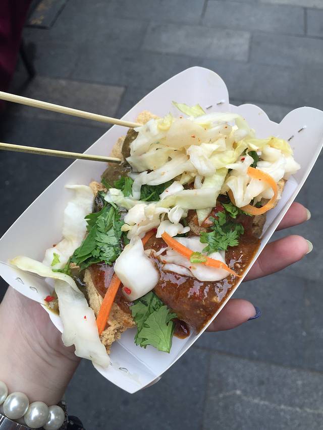 这家臭豆腐小有名气,一份10元,2份15,豆腐炸的很好,但是酱料有点咸