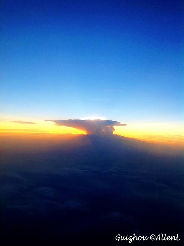 飞机快抵达贵阳机场时,看到远方一朵奇怪的云。感觉那里一定在下雨!
