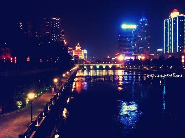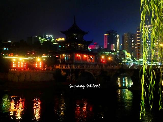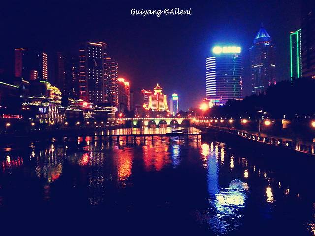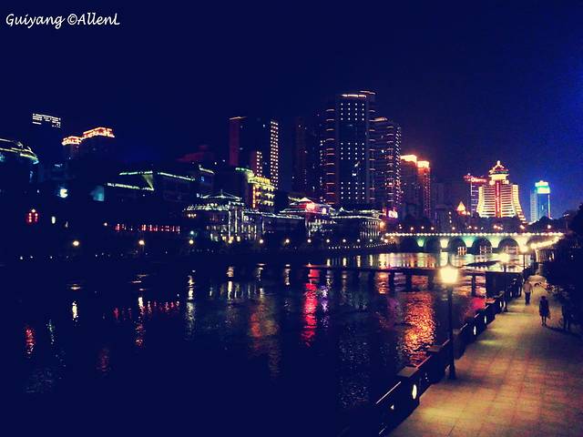 古韵十足的甲秀楼,与周围的现代建筑形成对比。在桥上可顺便一览灯火通明的河滨夜景。