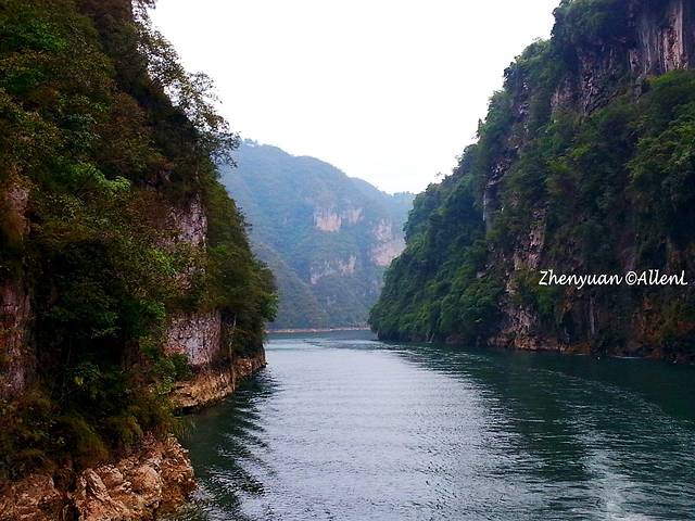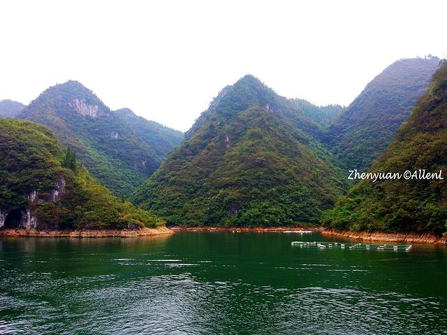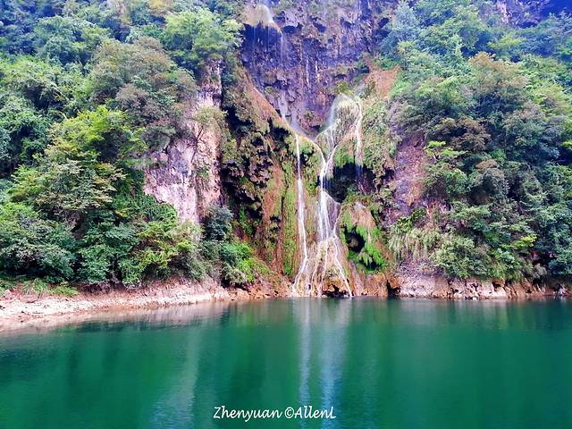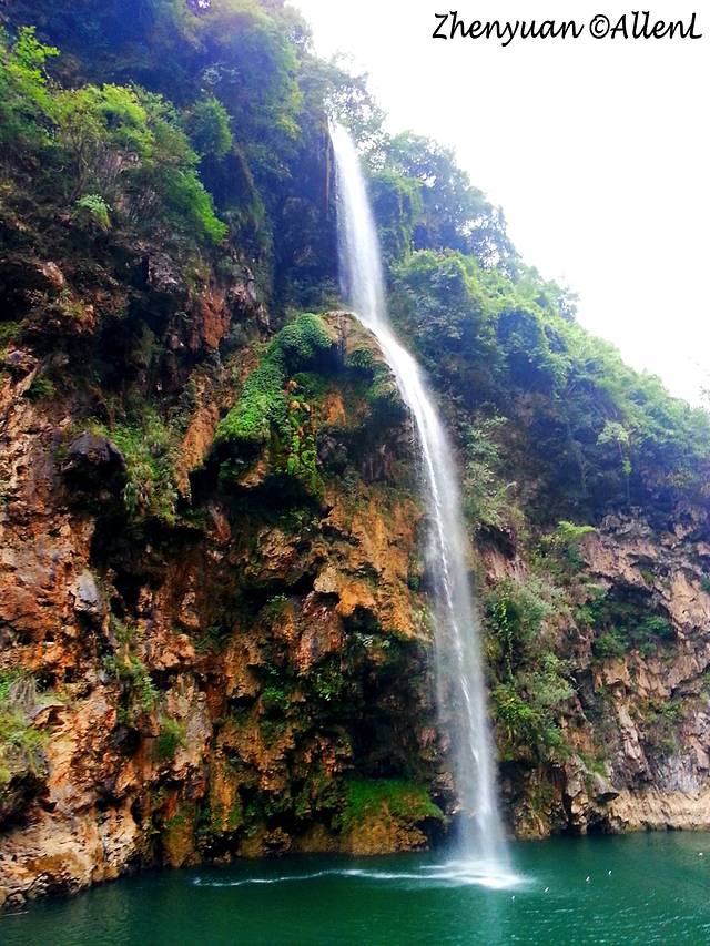 白绫在山间挥舞,在河上看瀑布颇为壮观!如果没记错,这瀑布叫“大飞水”。