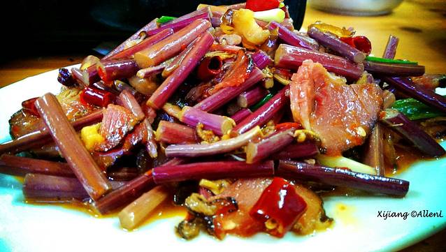 晚上下到寨子里,挑了个小饭馆解决晚餐。蕨菜腊肉还不错。