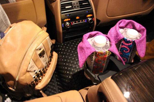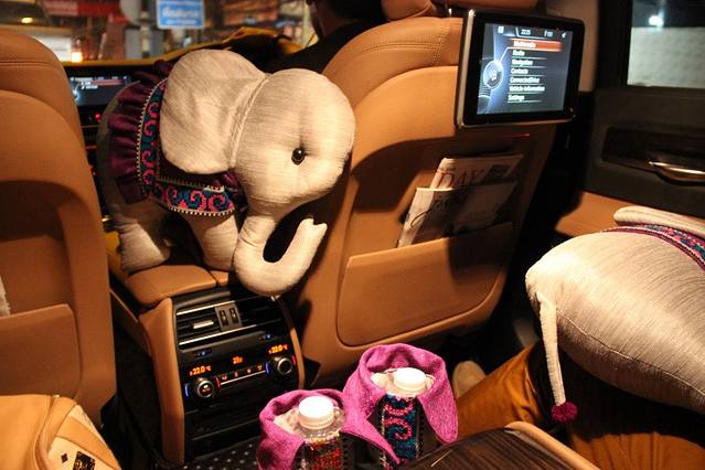 车子内部皮质奢华,小象抱枕超有爱,瓶装水的套套也很好看。