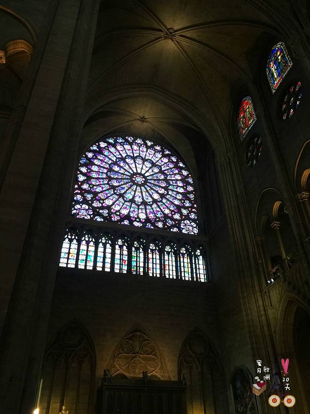 这里的“玫瑰玻璃窗”比之前的玻璃窗都要有气势,不仅直径很大,设计也精致对称又内涵丰富,巨大的玻璃窗被光线穿透,好像圣母的圣光和煦宽广,神圣感扑面而来。
