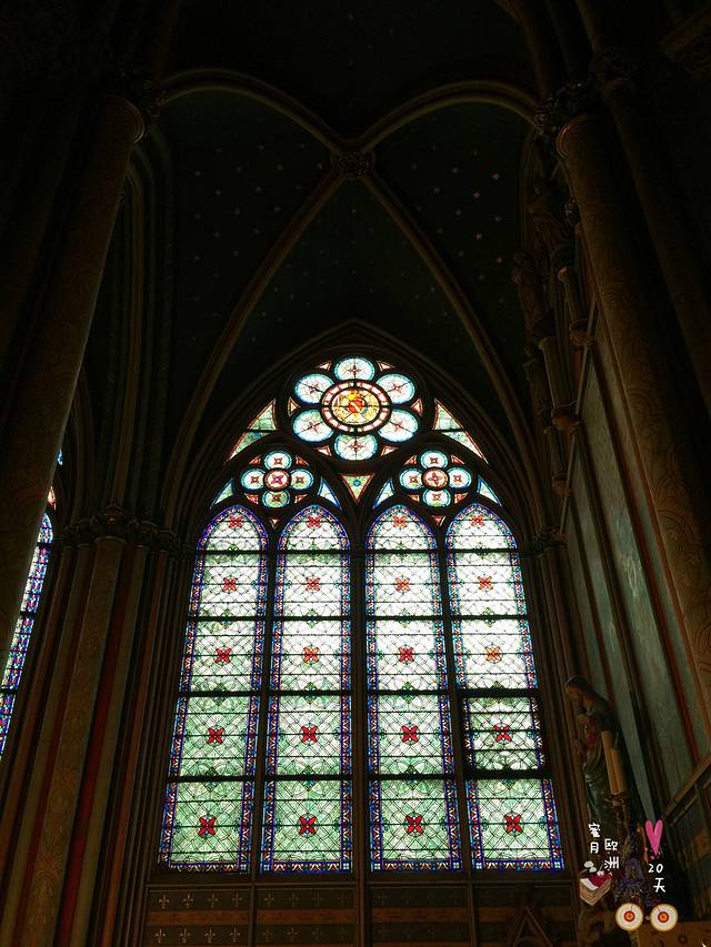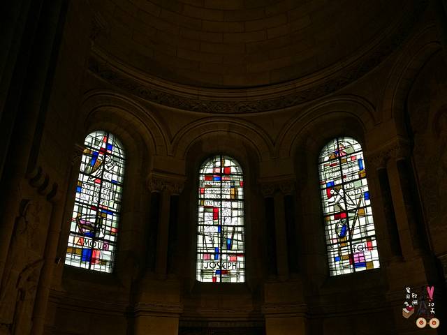 这个教堂里的彩色玻璃窗和其他教堂的很不同,线条简洁,白色为主,红蓝点缀,很现代。