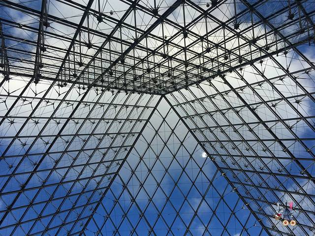宫前的金字塔形玻璃入口,占地面积为24公顷,是华人建筑大师贝聿铭设计的。透过玻璃金字塔的塔尖,看天空浮云流动,时间都静止了,感觉可以在这里发呆一整天。
