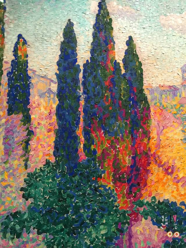 上图为局部《Les cyprès à Cagnes》柏树林,Henri-Edmond Cross