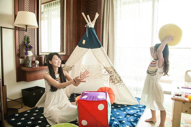 三亚香格里拉客房在设计上精心营造家的氛围,一个小帐篷、一张小书桌、一个画板,就让孩子收起思乡的苦。