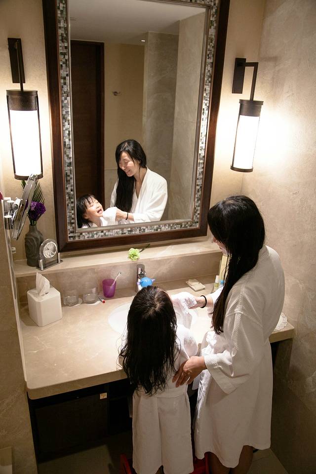 洗漱后,以全新的精神面貌迎接新的一天。酒店非常贴心。入住时告知有孩子相随,他们立刻会准备上宝宝拖鞋、浴袍和宝宝脚凳,方便宝宝使用。