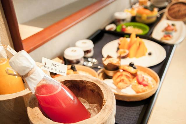 一杯西瓜汁清凉沁脾,香蕉马芬等烘焙式点心酥软可口。如果担心吃不惯,那就叫上虾饺、油条配白粥的标配中式早餐也很不错。