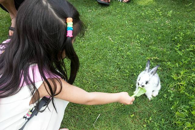 夏夏第一次接触小兔子,有点害怕。我告诉她,饥饿的滋味很难受呢,你吃饱了,但是可爱的小兔子正在挨饿呢,它很不舒服,它需要你的帮助。终于,夏夏努力克服心理恐惧,喂起兔子来。