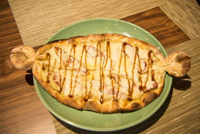 康提奇招牌菜,蕉味鸭肉披萨。它以船为造型,选用香甜的香蕉和咸味鸭胸肉为原料,吃时配上鲜姜酱和海南特色酸豆酱,是一番视觉和味觉的双重体验。