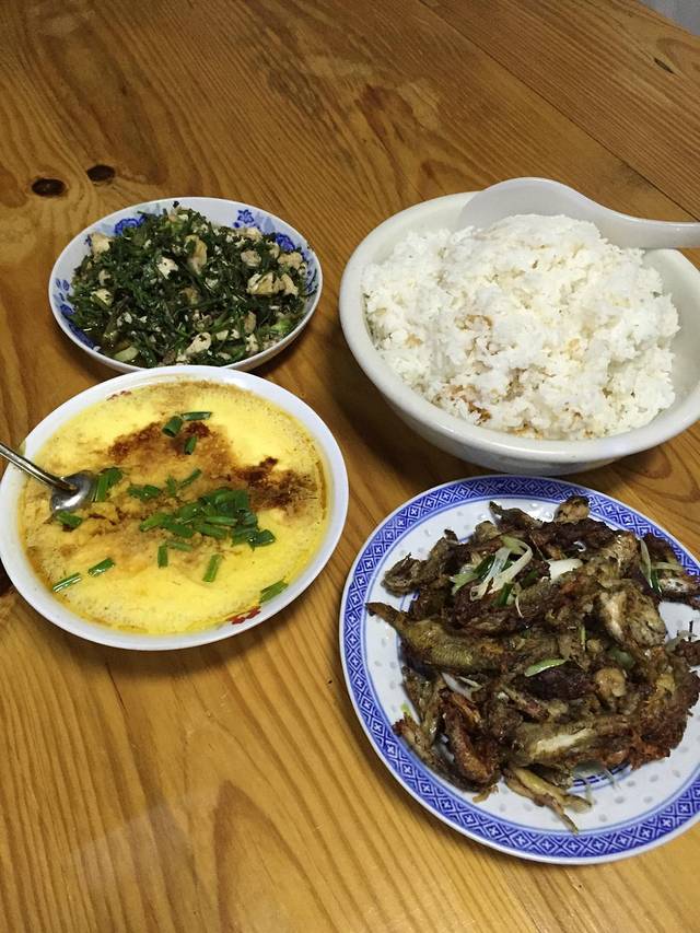 隔壁阿姨家的炸河鱼味道很是不错,金黄金黄的不是鸡蛋羹是鸭蛋羹哦,这就是我们呢今天的晚饭,美美哒。