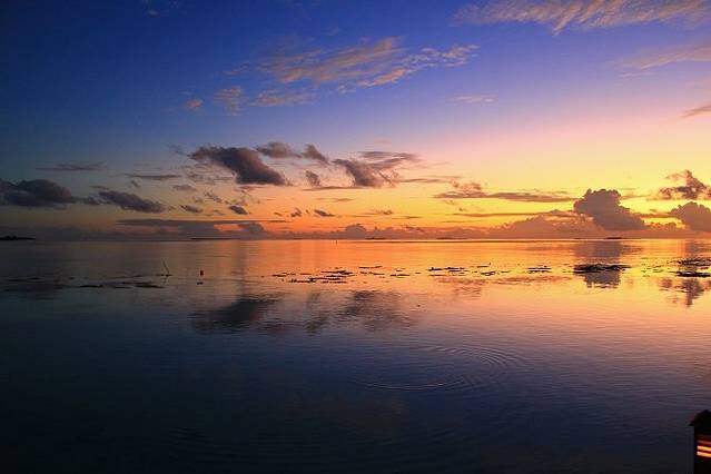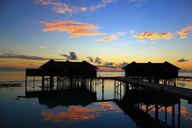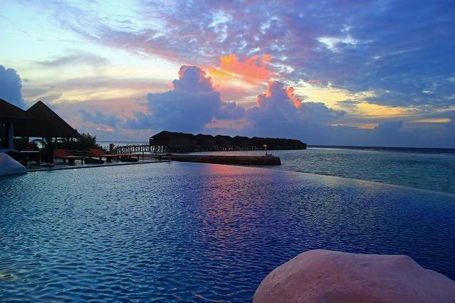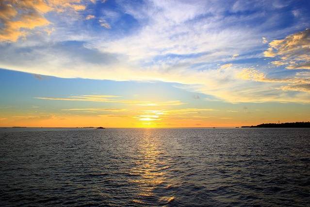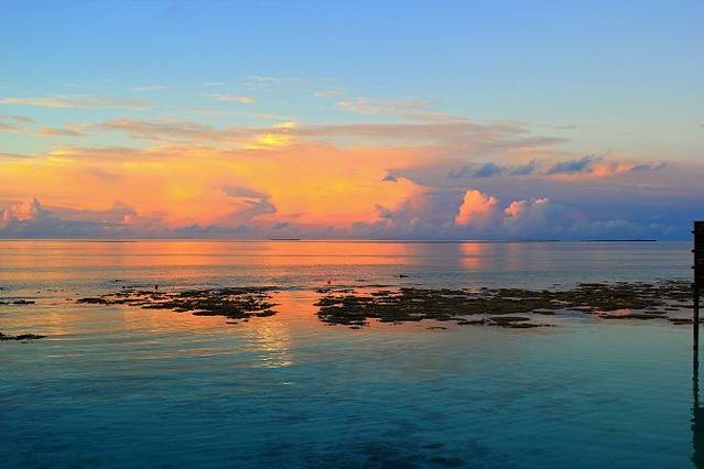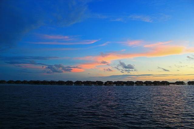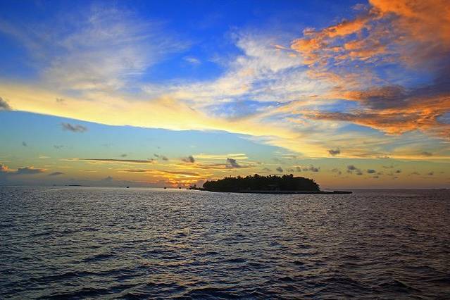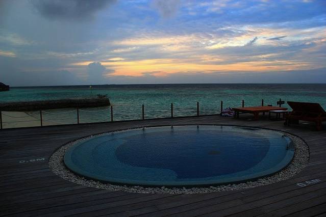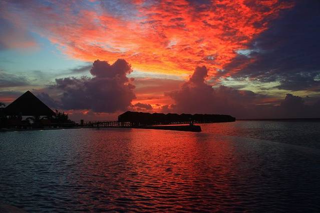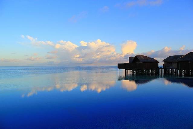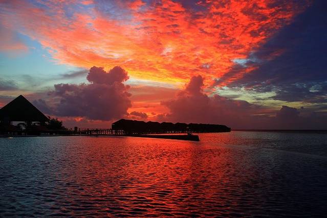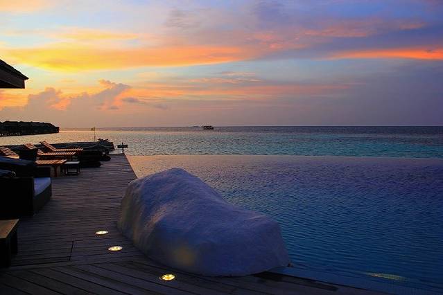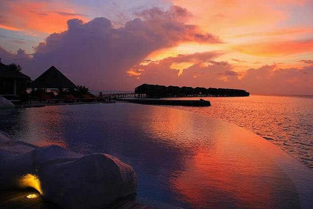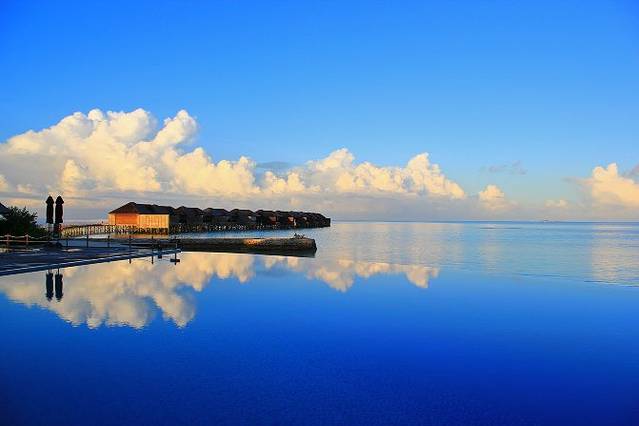 莉莉岛不仅有绝美的海水,还有令人终身难忘的落日余晖。一岛一世界,在这里,天空的颜色是时常变化的。傍晚时分,坐在无边泳池旁边的躺椅上,或是自家的水上屋露台上,远眺一天中最后一道阳光平和安详地沉落在印度洋里, 鲜艳的橘红色夕阳,将云和海染成同样的橘红色,这里是天堂。