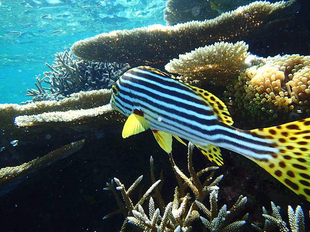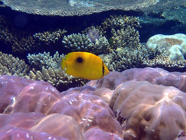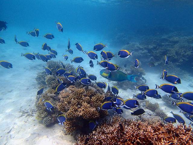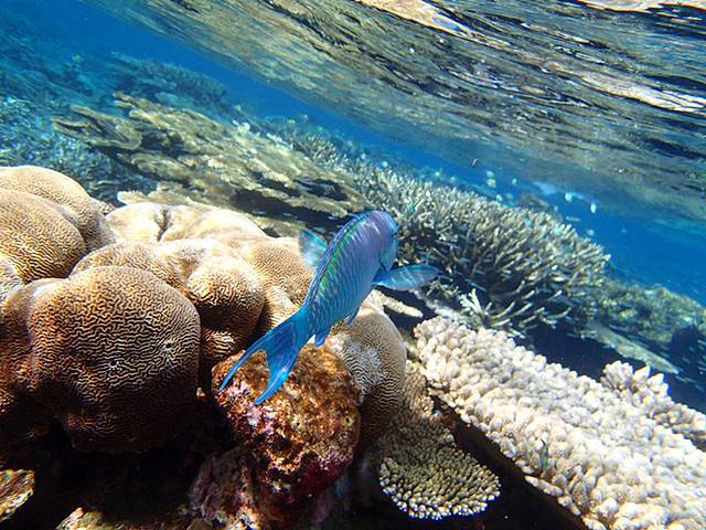 涨潮时,珊瑚离水面有一定的高度,可以在珊瑚礁上面浮潜~