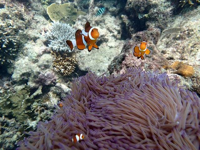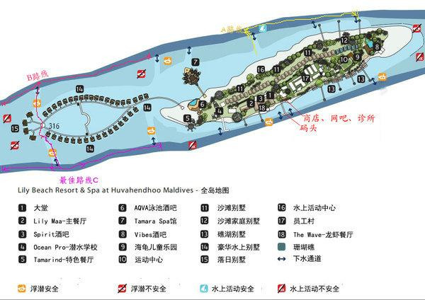 暗礁浮潜的线路是教练推荐初学者的线路(上图中A线路),出去的通道位于水上运动中心前方,是全岛最大的通道,很好找,通道深,离海沟较远,回来时从靠近防波堤的通道上岸。A线路景色不错,能见度比较好,但水流急需要注意安全,靠近出去通道处珊瑚破坏严重(修通道要炸开珊瑚),游一段后珊瑚就很好啦。顺着水流的方向几乎不用游,水流会带着你慢慢前进,全程大概40分钟。我们去的前一天都找水上活动中心的教练带着我们在路线A练习的,可以从岛的东侧到西侧是顺流,因此西面的水屋比较背风,水流较小。最东侧有防浪堤,没有通道不能浮潜。