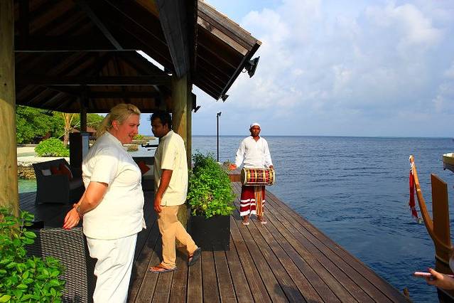 大约飞行时间25分钟飞机就开始降落了,不远处莉莉岛经典的多尼船来接我们了!一上船就会给你一条充满新鲜薄荷味的冰毛巾、一杯欢迎饮用水、水果冰棍,感觉好贴心的哦!看着越来越近的莉莉岛,心情也是越来越激动,感觉幸福迎面扑来~东西还没吃完就到了,有个很简短的欢迎仪式,小黑敲鼓,唱着听不懂的歌。