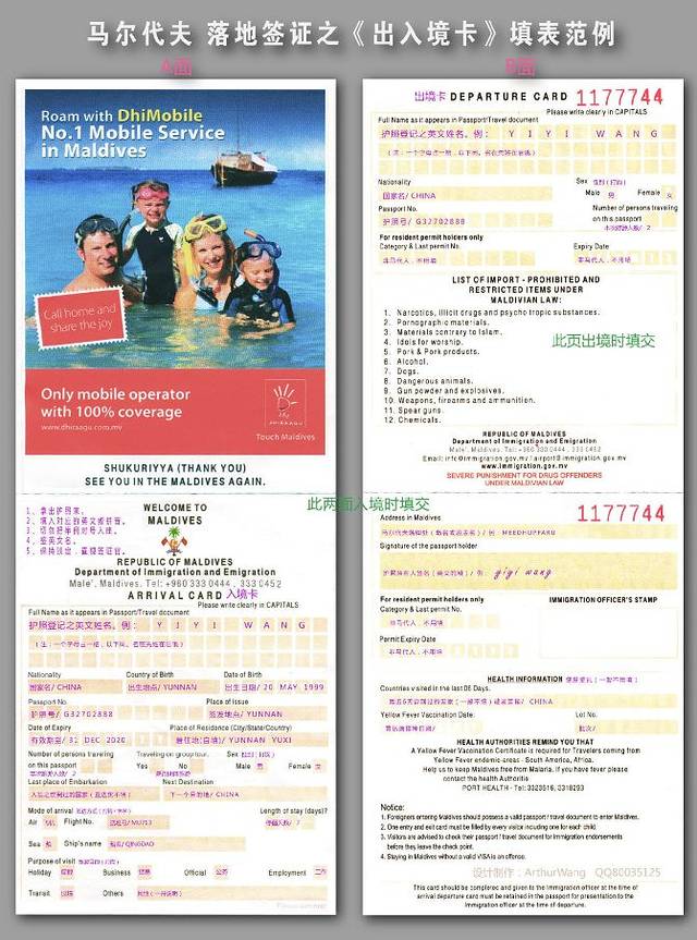8.记得带上一支黑色水笔或圆珠笔,飞机上填写出入境卡用的。马尔代夫虽然免签,但进入他国的出入境卡也是要填的,在等候赴马尔代夫航班的时候地勤人员会派发一分卡片(出境卡、入境卡、健康信息卡)给乘客填写,在马尔代夫边检时会收回入境卡和健康信息卡,留下出境卡给乘客,出境卡一定要小心保管,回来时需要用的。