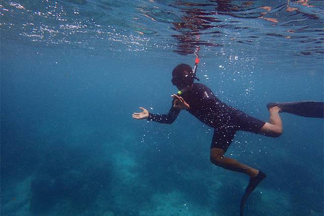 4.脚蹼一定要穿,救生衣初学者一定要穿!(海水浮力大,会游泳的人不穿救生衣也能漂浮,穿了救生衣就不会潜到海底去,万一浮潜中途感觉累可以是将身体翻过来休息片刻! )