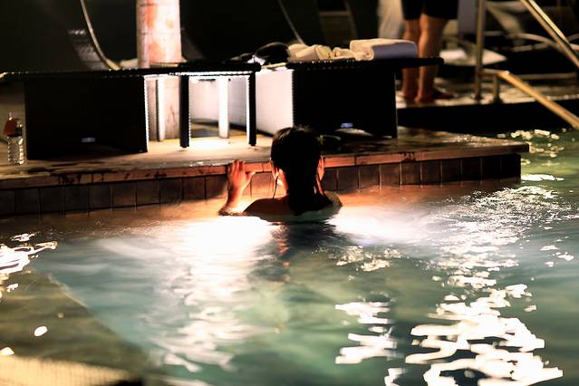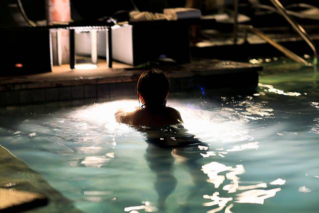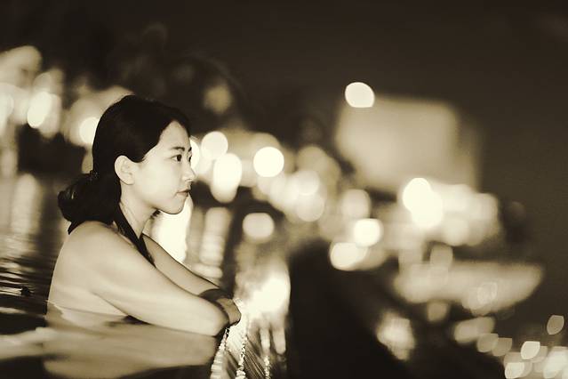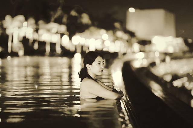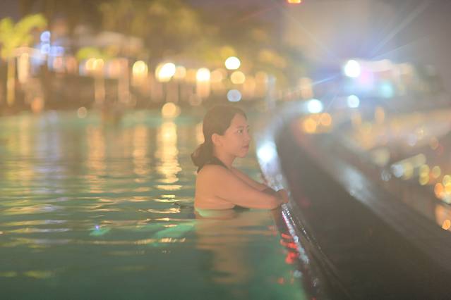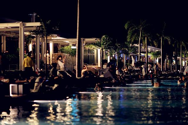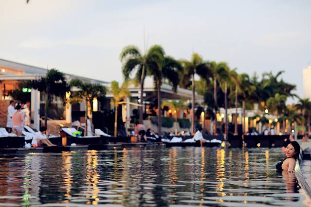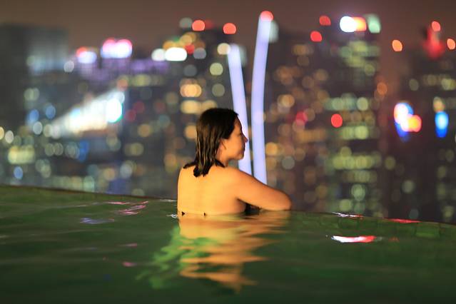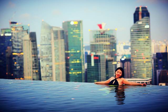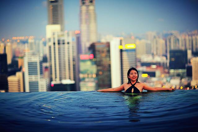 从摩天轮下来,匆匆忙忙赶回酒店,去无边泳池。无边泳池位于酒店的57层,出入都需要房间门卡。10点多的泳池还是很多人,我们游了一会,决定第二天早晨早起再来接着拍照。